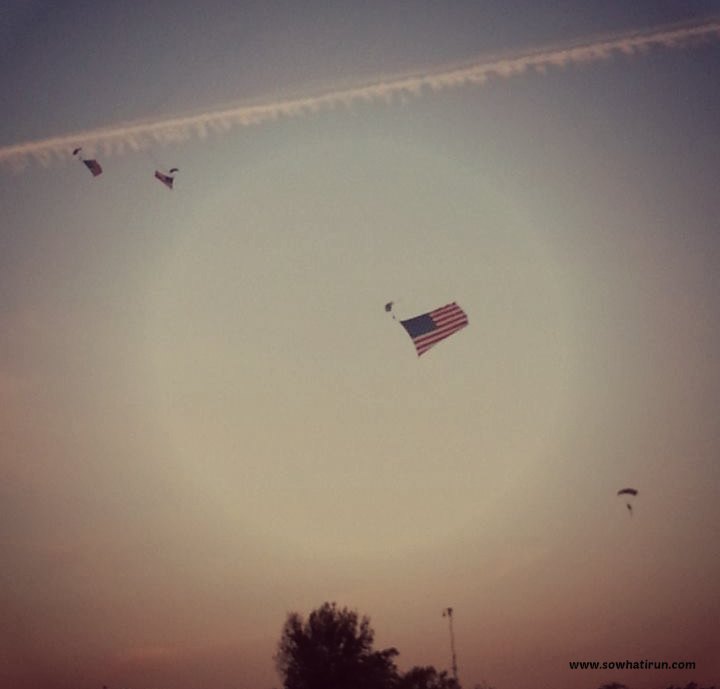 The race was scheduled to start at 7:55, so when I looked at my watch and it said 7:45, I was in a panic…we were still waiting in line!!! Little did I know that it would take me an additional 15 minutes after the howitzer shot off before my pace group even crossed the start line. While we were still waiting to use the potties, the opening ceremonies began. We saw the skydivers jump from their plane with American flags beautifully waving in the wind (notice there was only four jumpers in this shot, but I believe there were about a half a dozen jumpers). The view was breathtaking.