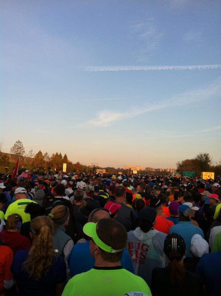 Instead of all four of us checking in separate bags, we consolidated everything into one and checked it in, and then headed to the port-a-potty lines…the long port-a-potty lines. As we waited, Meg realized she forgot to use Glide. Thank goodness Kendra had it with her, if only I were as smart as Meg. I did not glide at all. I had no idea what I was thinking, but I paid for it in the end. I’ve got a nice chafe burn all around the front of my ribcage where my sports bra rubbed and I ended up chafing in places that never chafed before…how THAT happened, Lord only knows (still hurts to sit a little).
