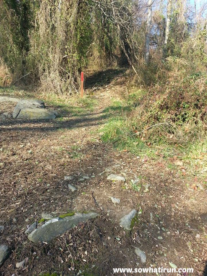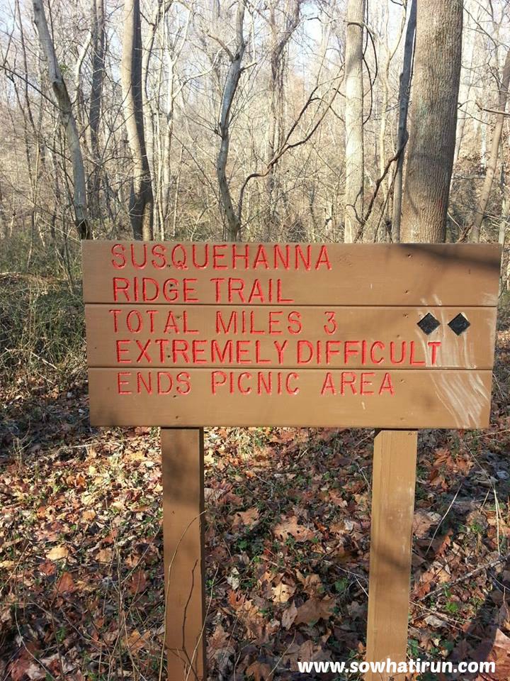 While that HAT Run training doesn’t officially start until next week, our coach gave us a schedule to get us acclimated to what’s to come. So, this morning Reds and I decided to head up to Susquehanna State Park and give it a go on the course to see what it was about. When we got to what we thought was our starting point, the “Susquehanna Ridge Trail” which marked with red signs, this is what we saw…