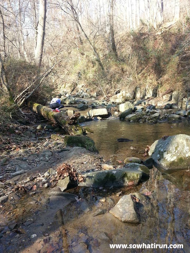 Yep. EXTREMELY DIFFICULT! So, when you decided to go out on your own on a trail for the first time, you should find the most difficult path and jump right in with both feet. <sigh> We stood there and looked at each other for a minute and decided, oh heck, why the hell not…until we got to this stream. We tried several ways to cross it, but the rocks had algae on them which made them very slippery. Now, I’m sure the die-hard trail runners (like the guys that helped us out) would’ve just ran right through the freezing cold stream getting both of their feet wet to get to the other side, but I just wasn’t there yet. Neither was Reds. We looked at our map and decided to find another path – one that was not marked “Extremely Difficult.”