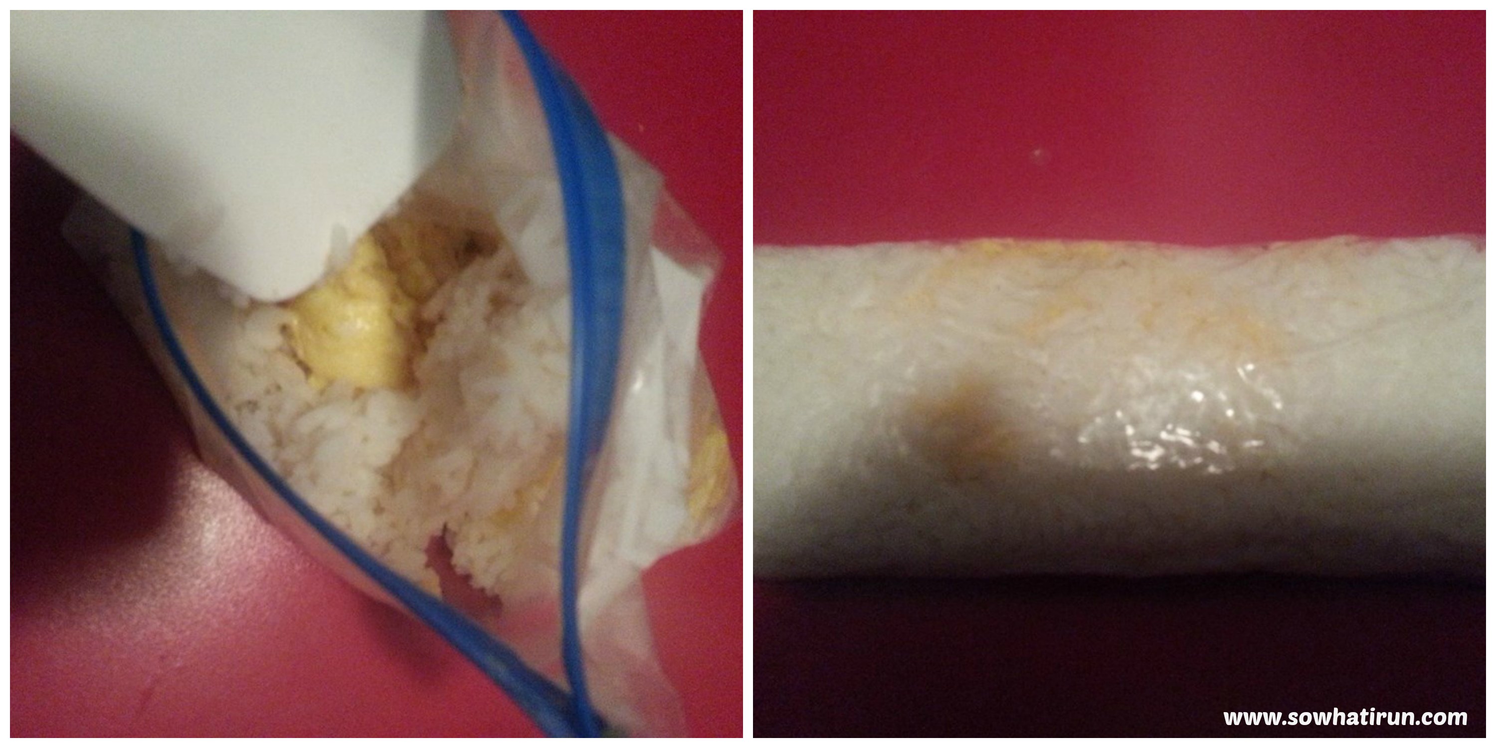 Anyway, on my quest to eat clean, I figured I’d try to make some real food for trail runs…and I don’t mean peanut butter and jelly sandwiches. I mentioned a couple of weeks ago about my rice and eggs concoction. When my family was visiting from Taiwan over the summer, they cooked up rice, eggs, and meat, stuffed it into a baggie and ate it right out of the bag when we went out on day trips. The American food was too greasy for them, so this is how they managed. You can’t get more real than that. No preservatives, added chemicals, etc. Just rice, eggs, and meat and you have your easily digestible carbs and protein. So I thought I’d try it on my first trail run but I left it in the car and ended up eating it as a recovery snack. When I took it with me last week on an actual run, I was able to try it. While the nutrition was right, it was not convenient. I think this is something that I will pack as a quick recovery snack to eat while I drive home.