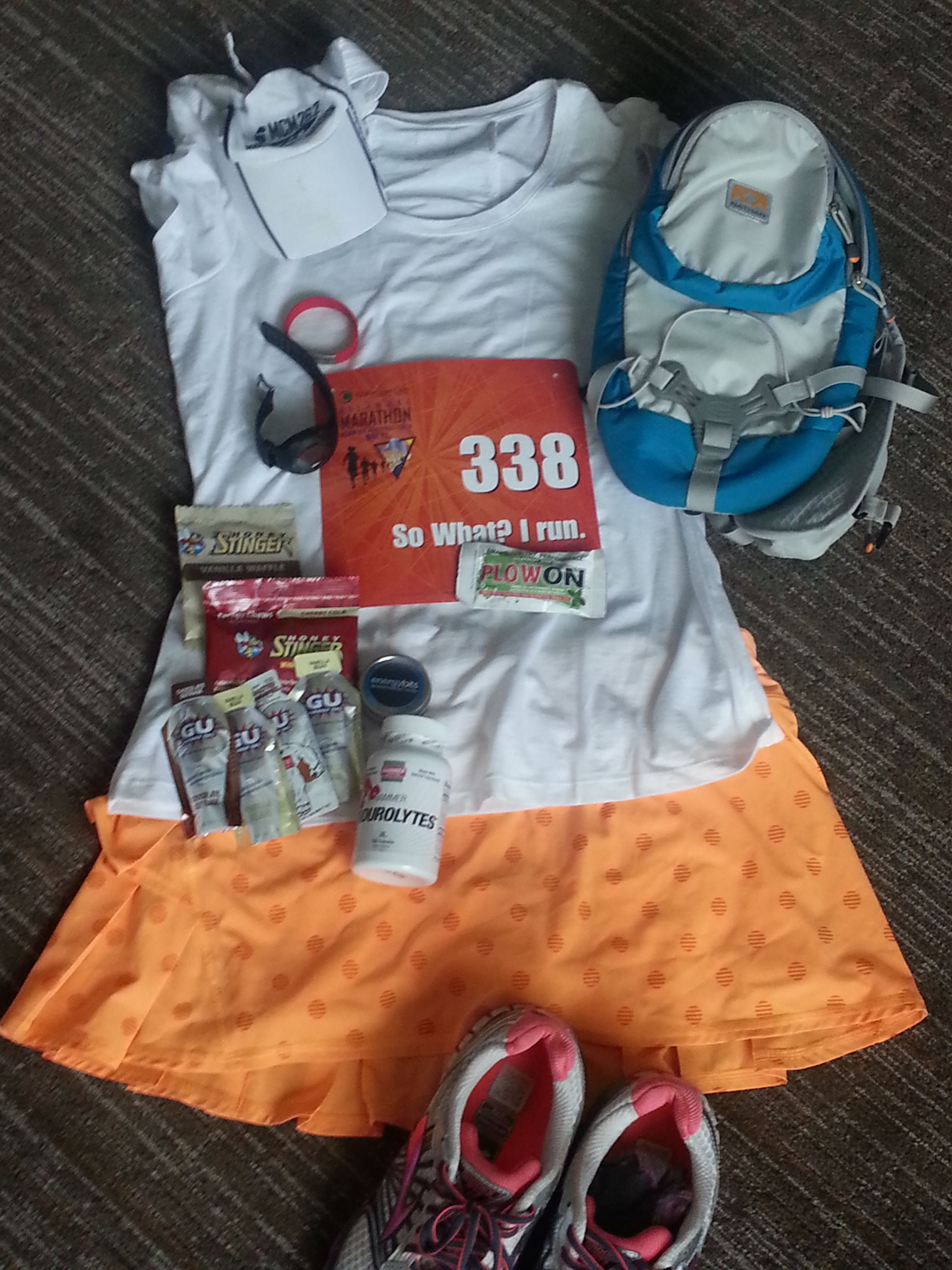As far as gear goes, I was okay with wearing the vest with a t-shirt and skort, but I’m not sure if the combo I wore is going to be right for the 50-miler. In a pinch, it will do.