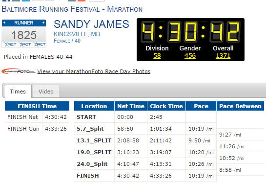 As I came into the final two miles, I saw that I was running an 8:50-ish pace. I thought I had the finish line in sight, but I had forgotten that long through-way of Eutaw street. Shit…pushed too hard, too soon. I started to get that tunnel vision that you get right before you pass out and I thought about my sister who is always worried that I’ll be the one to drop dead at the finish line because of my heart and lung issues. Not today sis, not today. My watch had turned 4:30 and I had less than a minute before it hit 4:31. I GAVE EVERYTHING I HAD…EVERYTHING. And I did it.